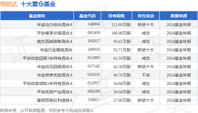 持有恒铭达最多的基金为华宝动力组合混合A,目前规模为11.82亿元,最新净值2.7882(3月28日),较上一交易日下跌0.47%,近一年上涨10.08%。该基金现任基金经理为刘自强。